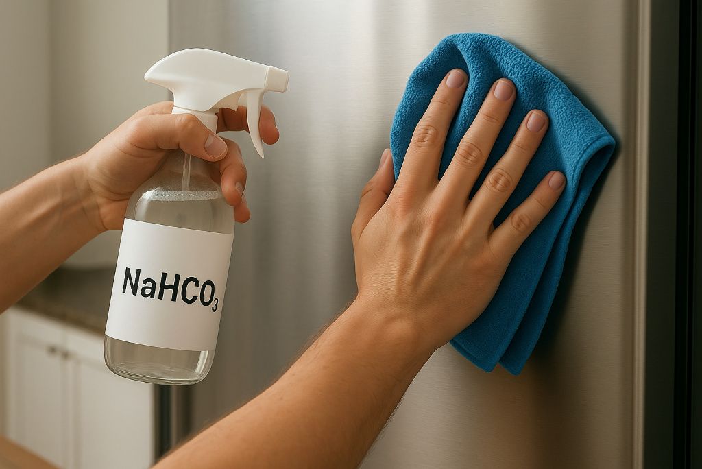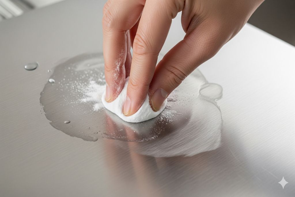 Baking soda is a mild abrasive that removes water spots, food residue, and other stubborn marks without scratching. Mix it with a little water to form a paste, apply it to the stain, and gently rub with a soft sponge. Thoroughly rinse and use a microfiber cloth to dry. Unlike harsh cleaners, baking soda won’t damage the protective chromium layer of stainless steel. The American Cleaning Institute recommends it as a safe, eco-friendly cleaning option for kitchens.